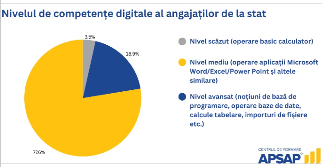 Aproape 72% dintre angajații la stat nu au urmat, în ultimii ani, cursuri de formare profesională care să le îmbunătățească competențele la locul de muncă, în special pe cele digitale, arată un sondaj realizat de Centrul de Formare APSAP, deși instituțiile statului sunt obligate prin lege să investească în perfecționarea constantă a angajaților pentru o eficiență sporită în administrația publică. De asemenea, doar 0,1% dintre funcționarii publici sunt interesați de cursuri de competențe digitale și IT&C. Astfel, specialiștii avertizează că personalul de la stat riscă să fie din ce în ce mai puțin calificat pentru locul de muncă și să nu se adapteze la schimbările aduse de tehnologie și digitalizare.