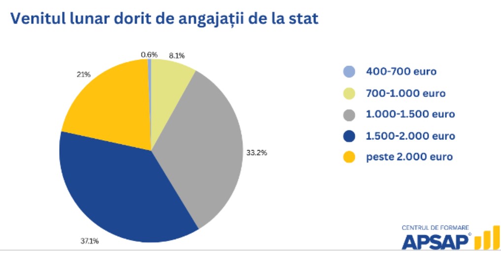 Angajații de la stat consideră că nu primesc, în prezent, salariul pe care îl merită: aproape 40% dintre ei spun că un venit lunar motivat este de 1.500-2.000 euro, iar pentru 21% vor un salariu de peste 2.000 euro, arată un sondaj realizat de Centrul de Formare APSAP.