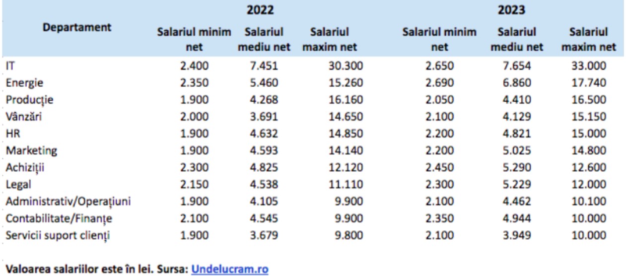 Salariile nete maxime în 2023 au fost în domeniile IT, energie și producție, iar cele mai mici au fost în producție, contabilitate, administrativ&operațiuni și vânzări, conform datelor pe care le oferă cei peste un milion de utilizatori ai Undelucram.ro, cea mai mare comunitate online a angajaților din România.