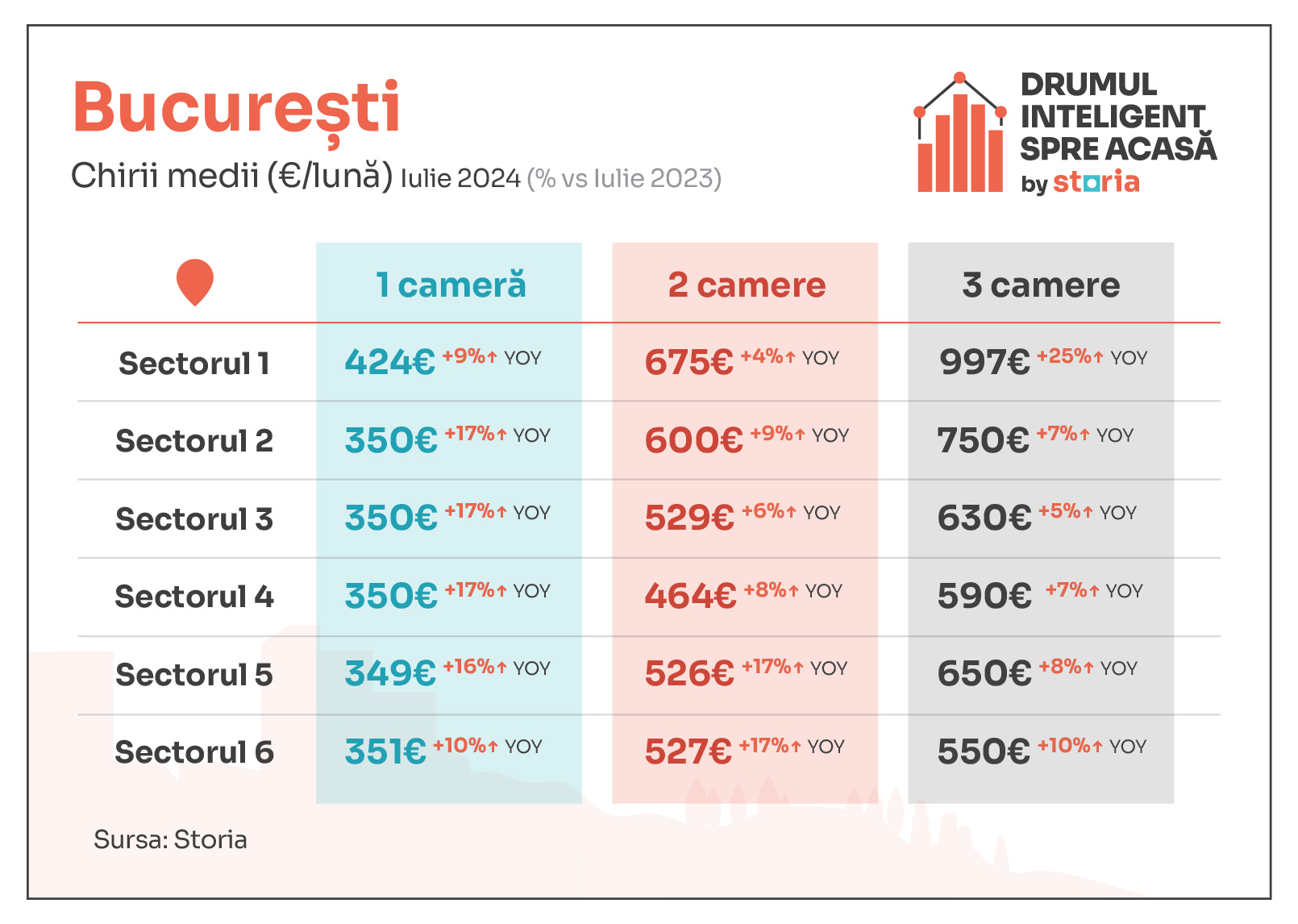 Prețurile solicitate pe Storia pentru chiriile din cele 10 orașe analizate, orașele cu cele mai multe anunțuri de pe platformă, au înregistrat o creștere de 14% de la un an la altul (iulie 2024 vs. iulie 2023), în timp ce prețurile solicitate de la o lună la alta (iulie 2024 vs. iunie 2024) au crescut cu 3%. Astfel, prețul mediu solicitat pentru închirierea garsonierelor și apartamentelor cu două și trei camere a fost de 500 euro în iulie 2024.