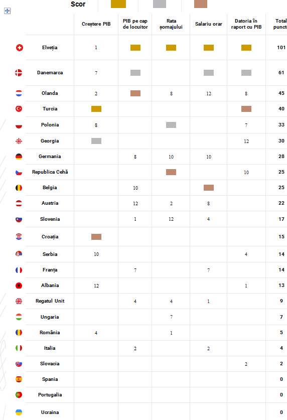 Rezultatele din tabel arată că învingătoarea absolută a „campionatului european la economie din 2024” este Elveția. Până nu de mult, Danemarca putea concura cu statul elvețian în ceea ce privește parametrii economici. Olanda a încheiat pe poziția a treia.