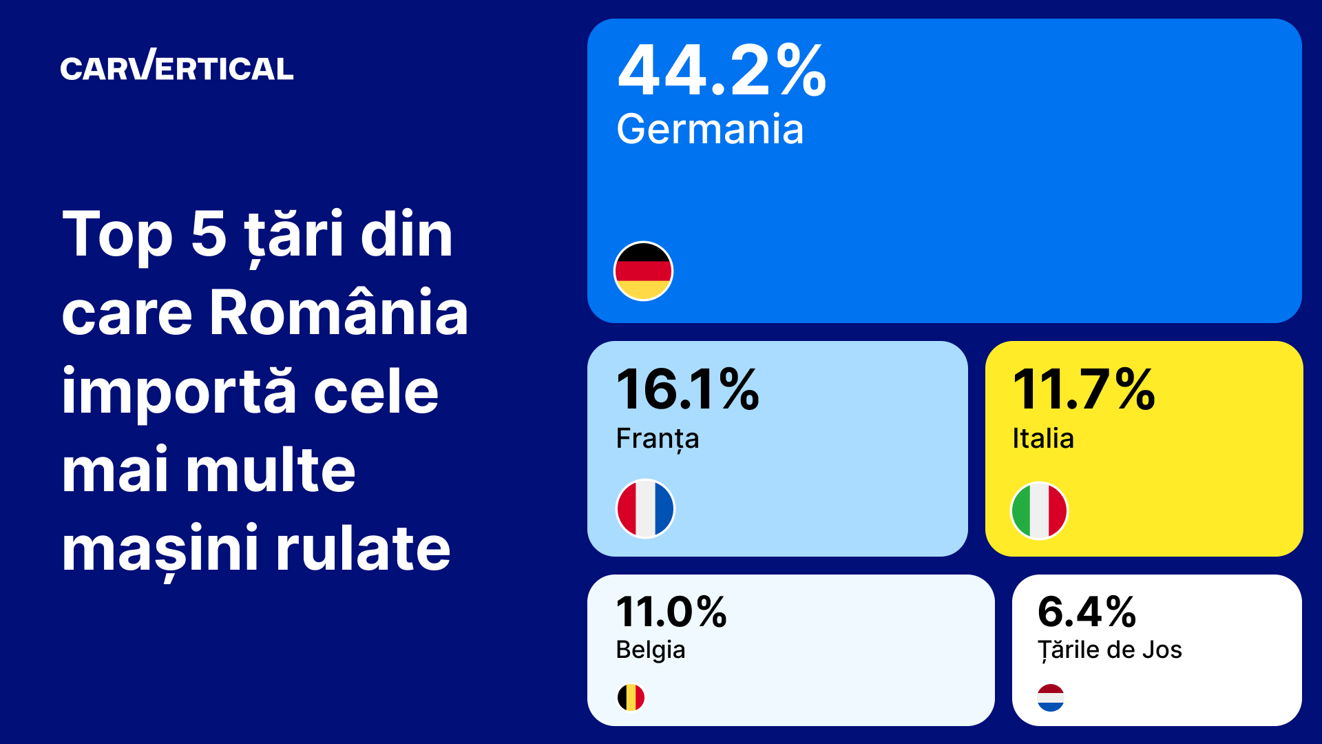 carVertical a analizat rapoartele care prezintă istoricul vehiculelor achiziționate de utilizatorii platformei în 2023 și le-a numărat pe cele care au înregistrări istorice din alte țări. Dintre toate mașinile importate anul trecut în România și verificate pe carVertical, 44,2% au fost importate din Germania, 16,1% – Franța, 11,7% – Italia, 11% – Belgia și 6,4% – Olanda.